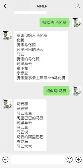 很像一些文章标题,可能预处理的时候没有对词长做一些限制,感兴趣的同学可以详细统计一下这份词向量的词长分布。当然,少量的 bad case 不会降低这份难得的中文词向量的质量,也不会降低我们玩转这份词向量的兴趣,继续测试一些词或者短语。例如输入"相似词 马化腾"、"相似词 马云",会得到: