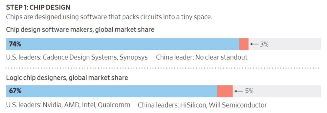 前者又称芯片设计自动化(EDA),美国占据绝对优势: