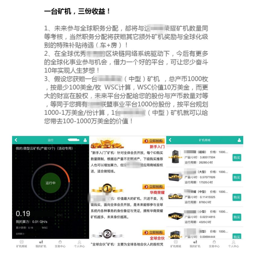 挖矿这个火热的区块链概念也自然用在了各种山寨币的套路中,许多项目会宣传通过挖矿可以自动产生虚拟币,可以通过挖矿源源不断得到他们的币,也就是源源不断地获取利润,这个挖矿是通过在他们的系统里拥有矿机才能进行挖矿,这些矿机同样大多是他们虚构的内容,背后没有任何实体设备,没有任何区块链技术的挖矿作业,仅仅是在向用户展示的页面上做点虚假贴图、动画,产生些虚假数字让用户以为真的是在云挖矿。
