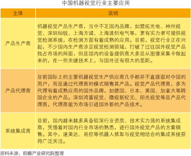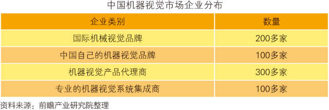 根据中国机器视觉产业联盟(CMVU)调查统计,现在已进入中国的国际机器视觉品牌已近200多家,中国自有的机器视觉品牌也已有100多家,机器视觉各类产品代理商超过了300家,专业的机器视觉系统集成商也有100多家。