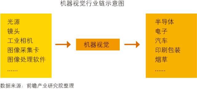机器视觉行业的上游有光源、镜头、工业相机、图像采集卡、图像处理软件等的提供商。行业下游应用较广,主要下游市场是半导体和电子制造行业。除此之外还有应用到汽车、印刷包装、烟草、农业、医药和交通等领域。