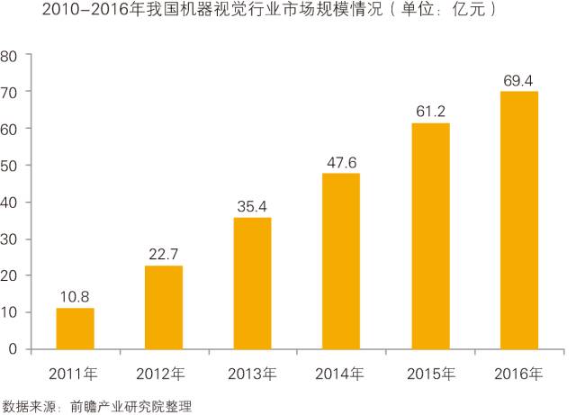 2011年我国机器视觉市场开始启动,行业步入快速发展期,2011年我国机器视觉行业市场规模约10.8亿元;2013年达到35.4亿元,同比增长55.94%;到2016年,市场规模达到69.4亿元,同比增长13.40%,约占全球市场15%的份额。