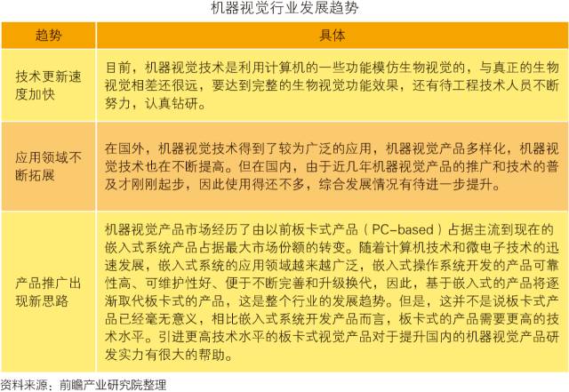 上游行业对机器视觉行业主要有两方面的影响:一是上游行业的技术和产品质量对机器视觉行业的影响;二是来自产品价格的影响。例如光源技术在机器视觉系统中非常重要,光源技术的发展能使光源更接近于明亮、均匀、稳定,这也提高了机器视觉产品的质量。此外上游产品的价格提高会给机器视觉企业带来一定的成本压力。