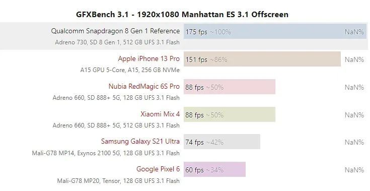 巨大的提升幅度,让骁龙 8 Gen 1 硬刚苹果 A15。知名图形跑分软件 GFXBench 测试结果显示,骁龙 8 Gen 1 工程参考设备在多个项目中战胜了 iPhone 13 Pro。大家比较看重的 GFXBench 曼哈顿 3.1 离屏测试项目上,骁龙 8 Gen 1 最终成绩 175fps,小胜 iPhone 13 Pro。