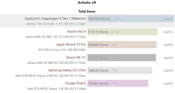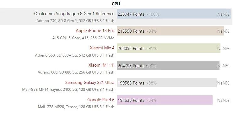 安兔兔的 CPU 跑分结果有些类似, 骁龙 8 Gen 1 的 CPU 跑出 22.8 万分,骁龙 888+ 的小米 MIX 4 为 20.8 万分,安兔兔跑分冠军为黑鲨 4S Pro 是 21.2 万分(图表未列出)。两相对比,提升同样不多。