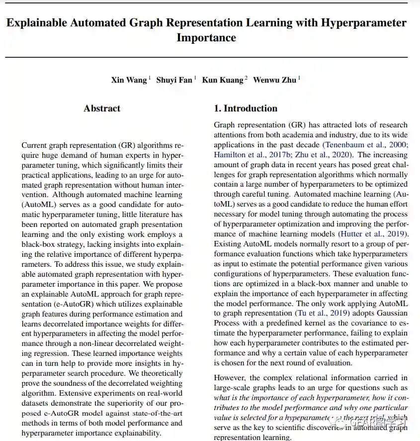 Highlight: We propose an explainable AutoML approach for graph representation (e-AutoGR) which utilizes explainable graph features during performance estimation and learns decorrelated importance weights for different hyperparameters in affecting the model performance through a non-linear decorrelated weighting regression.
