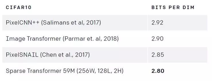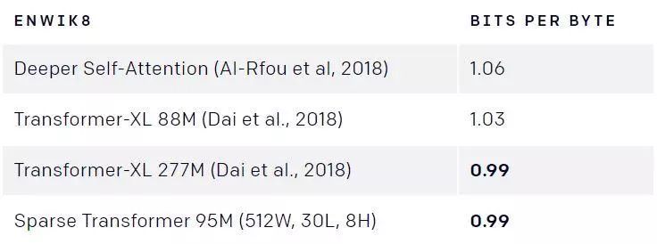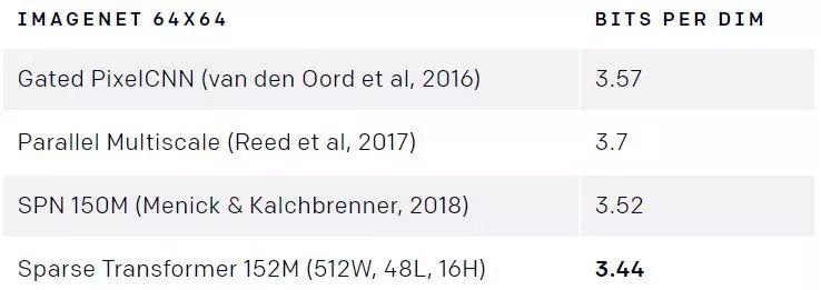 稀疏 Transformers 模型在 CIFAR-10、Enwik8、Imagenet 64 数据集上的密集估计任务中取得了目前的最好成绩。