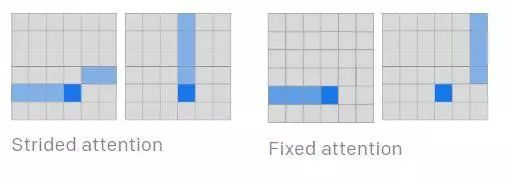 即便已经有了节省内存的方法,面对很长的序列输入时把每个注意力矩阵都计算出来仍然是不实际的。OpenAI 转而使用稀疏的注意力模式,也就是说,每个输出位置在计算时只考虑一部分输入位置的权重。当取的这一部分相比于全部输入位置很小的时候(比如一共 N 个输入元素,取 √N 个),即便对于很长的序列也是可以计算注意力的了,计算复杂度也就响应降低为 O(N√N),不再是完全计算时的 O(N2)。
