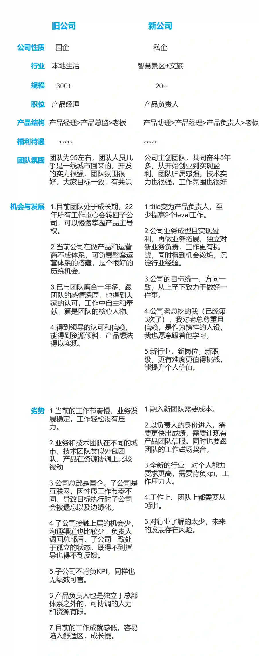 新公司:产品工作更有挑战性,对个人的思考能力,行业能力、学习能力、抗压能力、管理能力都有更高的要求,而且必须是结果导向,比个人驱动更有力。劣势也在于换了新公司,至少要有1年的时间去发展事业,那成家这个事上对应也要顺延一年。