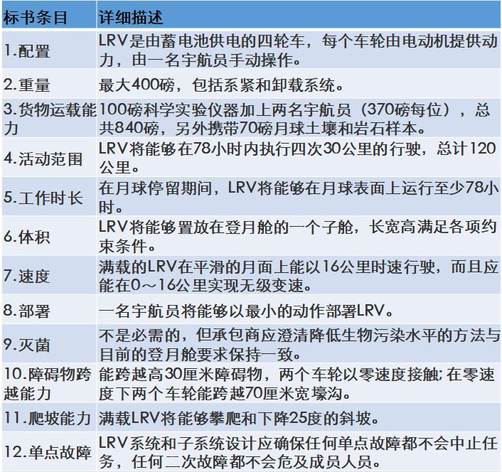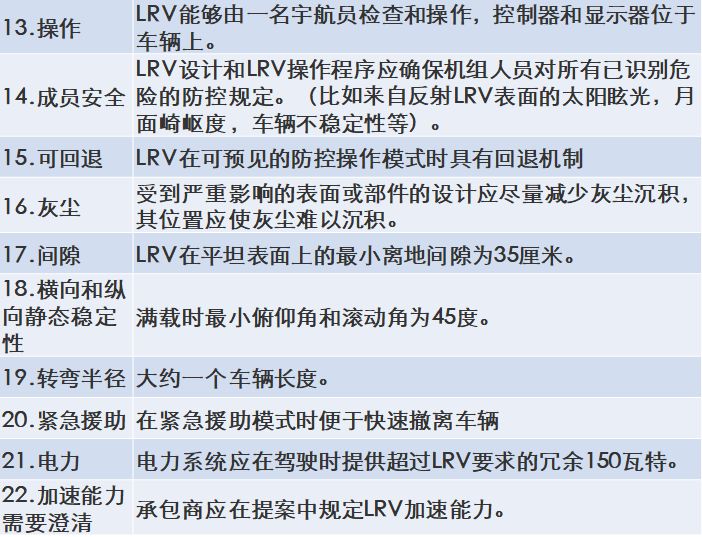 然后,在 1969 年 7 月 11 日,也就是在阿波罗 11 号登月成功之前不久,LRV 任务组根据之前的广泛研究,向 29 个 NASA 承包商发出标书,列出了月球漫游车的 22 项具体要求,分别是: