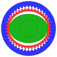 从上图可以看到柔轮比刚轮要少几个齿牙,波发生器的椭圆轮强迫柔轮变形,两端咬合刚轮并旋转,当波发生器绕刚轮走了一周之后,实际上柔轮,磨洋工,基本是原地踏步,还退步了,少走了几个齿牙。对的,我们要的就是这个效果,减速比就出来了,而且非常可观。用视频比较方便看懂一些: