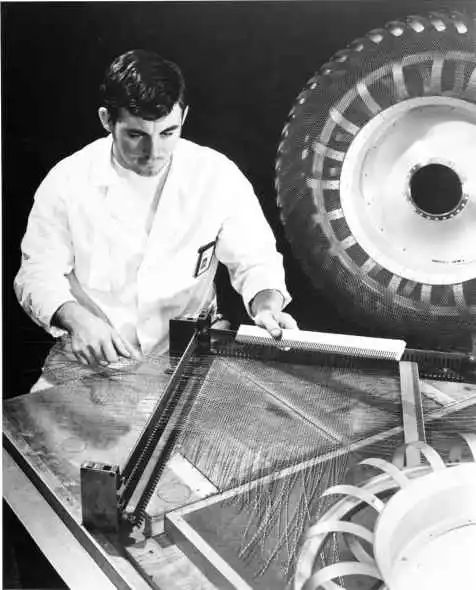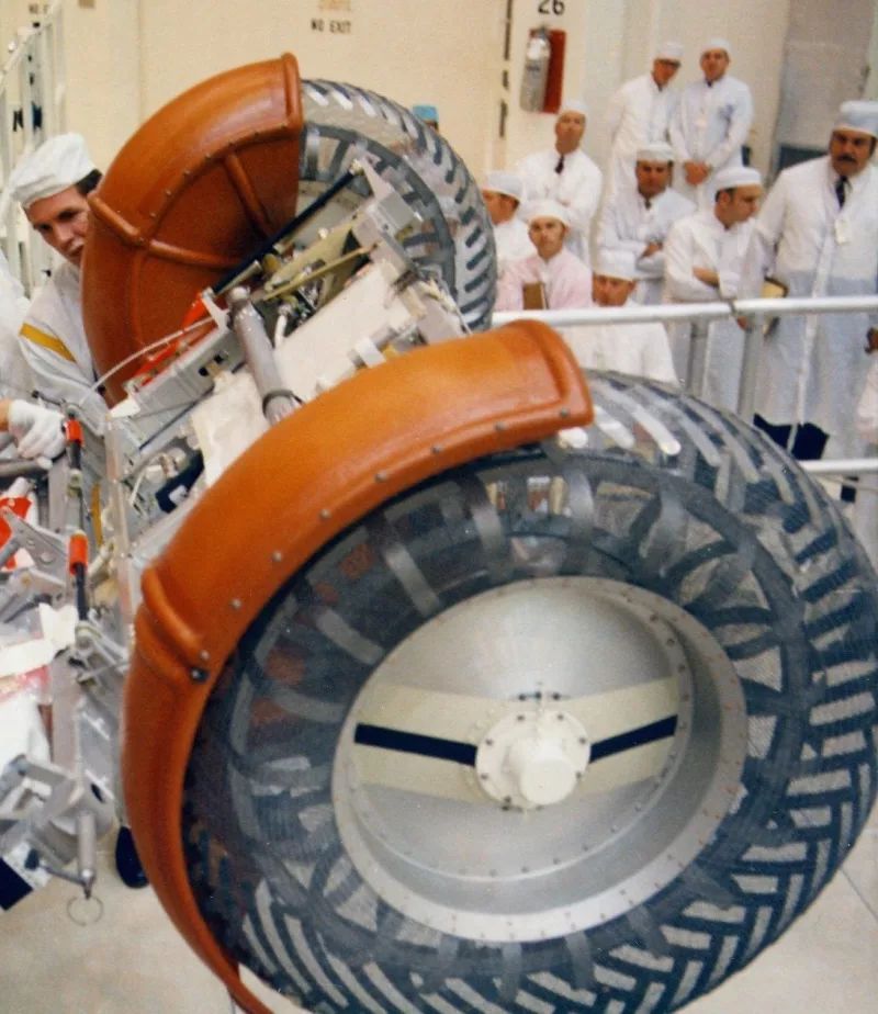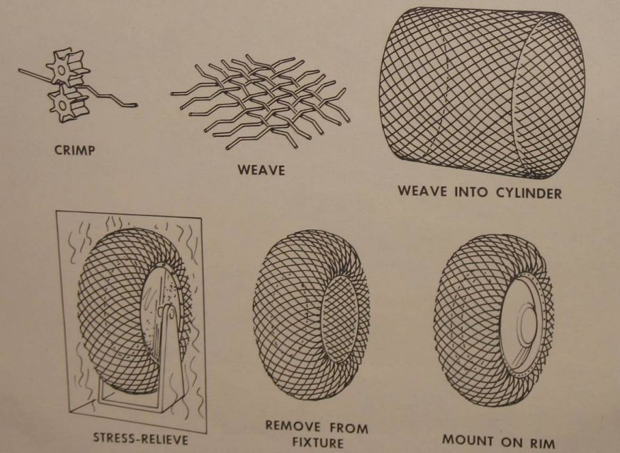 最大的挑战,来自减重,前期马歇尔太空中心通过大量的论证,固特异充气橡胶胎(不耐高温)、格鲁曼的金属扫把轮、风火轮、Bendix 的弹力圈圈轮(太重)都不及通用汽车的金属丝编织轮胎,现在进入「量产」阶段了。