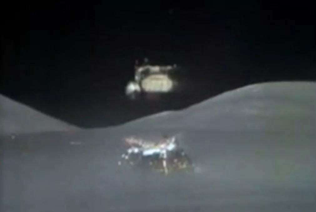 另外阿波罗 16~17 号月球漫游车上的摄像机,也拍摄到了珍贵的登月舱上升级离开月球画面。下图为阿波罗 17 号两名宇航员离开月球的刹那,这是阿波罗计划的最后一章。