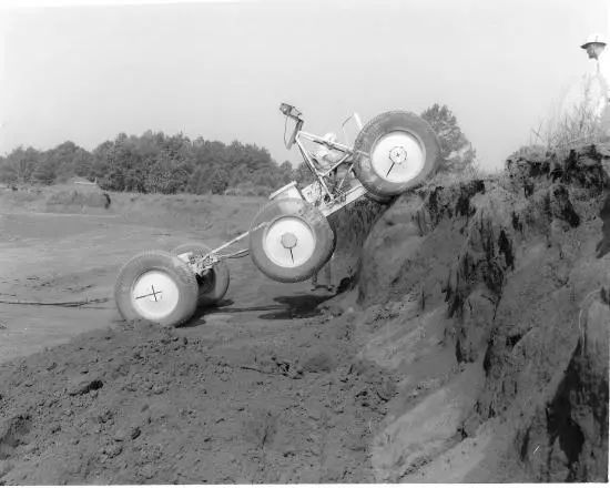 图 5. Bendix 研发的移动测试站 (MTA),在马歇尔太空飞行中心演示弹力圈圈轮的减震效果。测试数据有助于设计月球车