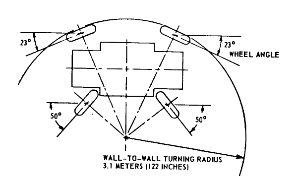 4 个车轮由嵌入轮毂的 4 个刷式直流电机独立驱动,四驱、四轮转向实现更好的自主性和更高的机动性,满足在 3.1 米最小转弯半径,符合标书的要求。