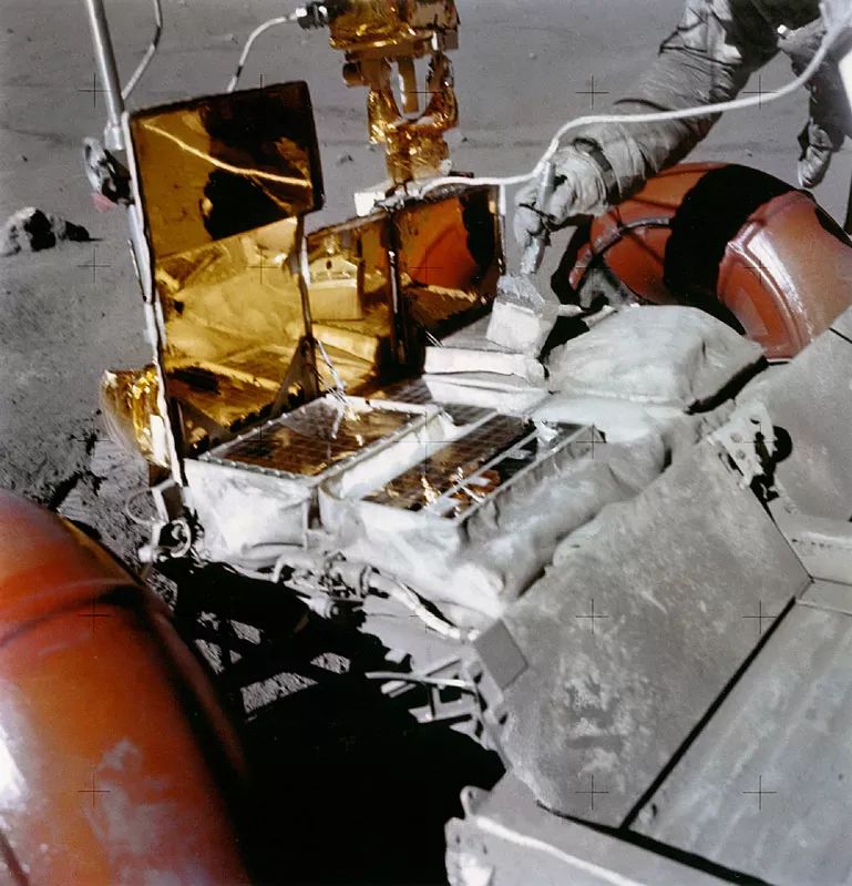 图 26. 防尘罩打开,辐射散热器进行散热,蜡重新凝结。边上的宇航员在清理恼人的月尘