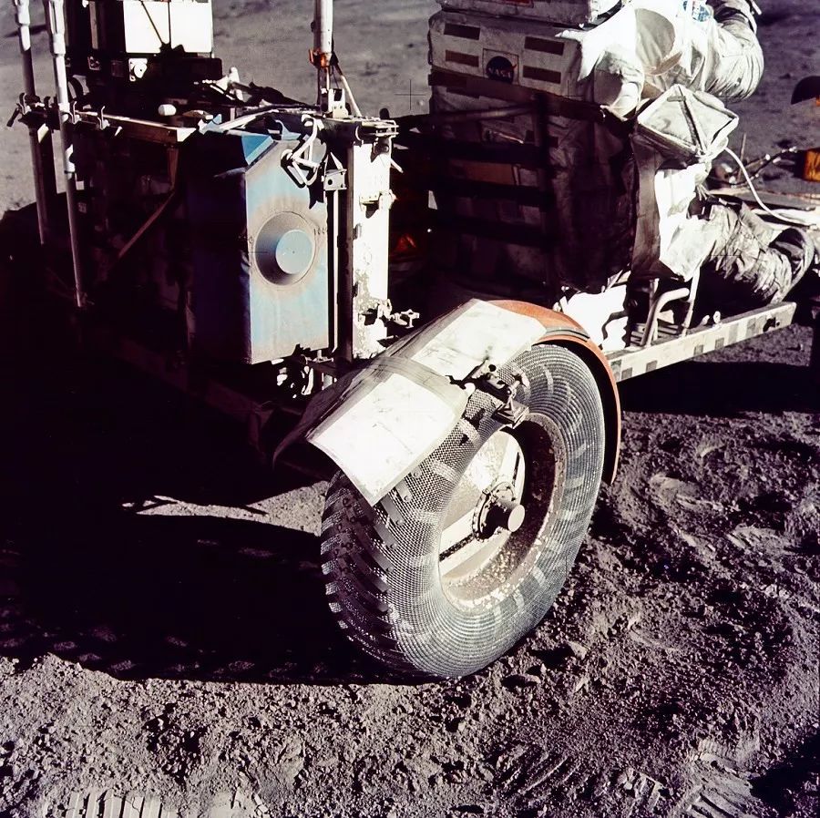图 30. 阿波罗 17 号的月球车后轮挡泥板破裂,宇航员临时进行了简单修补,算是小瑕疵