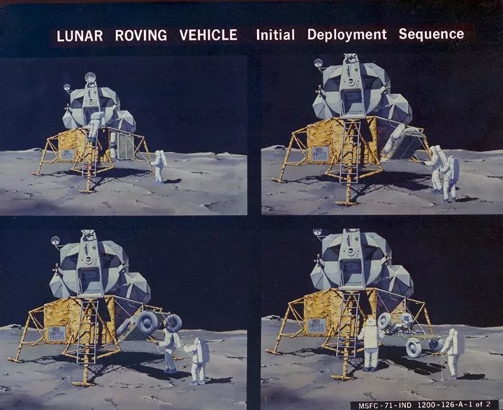 阿波罗 J 款登月舱的仪器分舱体积不大,怎么能够容纳下 LRV 呢?靠的是 LRV 的超级变变变。首先是放倒座椅,然后将前车身折叠,两个前轮八字对折,最后是将后车身折叠,两个后轮八字对折。