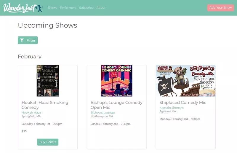 本地的喜剧节目很难找,因为剧目分散在Facebook团体,喜剧俱乐部网站和TicketMaster和Eventbrite之类的门票销售商中。我希望WanderJest能够把这些不同的来源统一起来,让观众更容易找到演出。想法基本跟Bandsintown一样,但是是面向喜剧的而不是乐队。