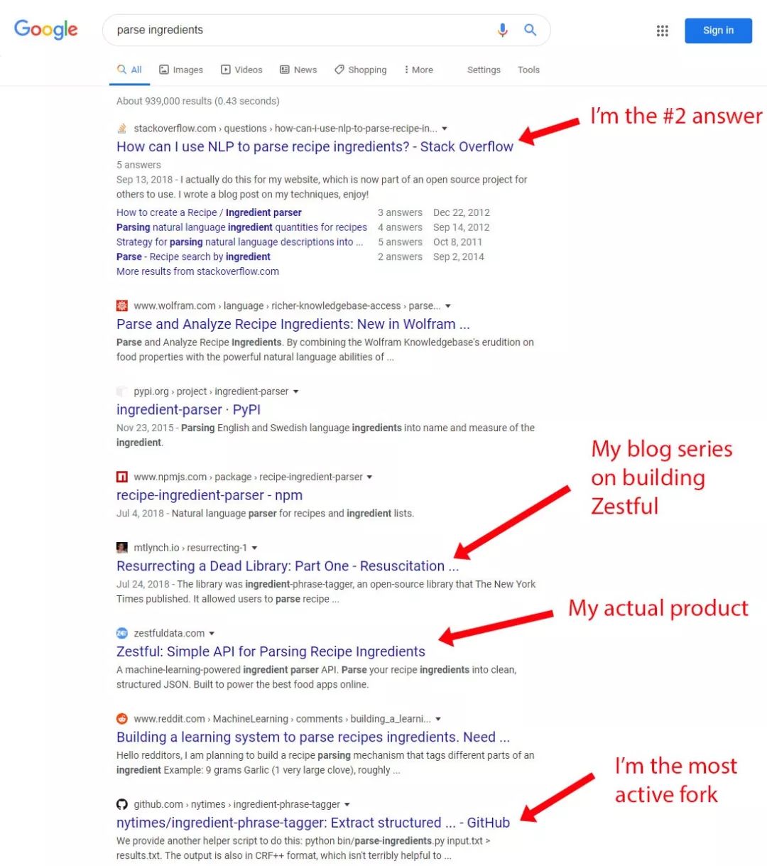 如何把产品出售给一个尚不存在的公司呢?我的策略一直是在SEO上做文章,让Zestful在类似“配方分析”之类的查询中保持一个很靠前的排名。