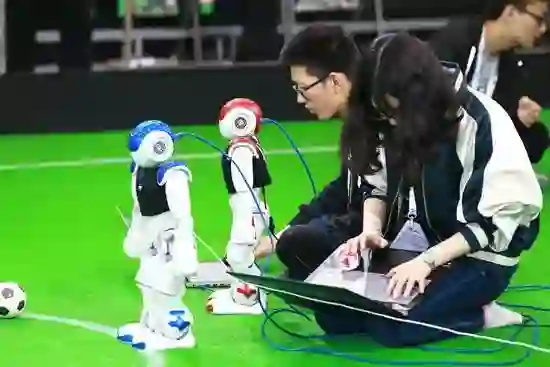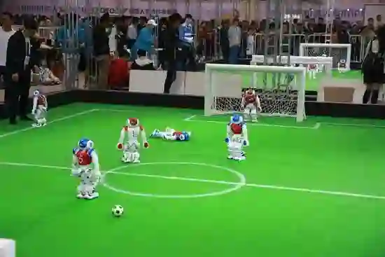 球场上,一个西瓜大小的机器人抬起右脚,准备发力,踢球射门,不料,右脚抬得过高,瞬间失去平衡,摔倒在地。弓起腰铆足劲,想要爬起来,却在一番挣扎后未果,只好作罢。