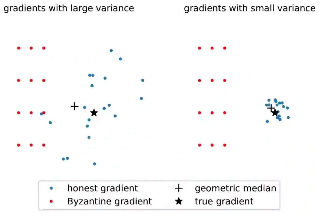 当拜占庭工作节点的数量 B <W/2 时,几何中位数可以很好地接近均值{(m_w)^k}。这一特性使 抗拜占庭攻击的 SGD 算法 能够收敛到最优解的邻接点。图 1 示出随机梯度噪声对几何中位数聚集的影响。蓝点表示诚实的工作节点发送的随机梯度。红点表示拜占庭工作节点发送的恶意信息。加号表示基于几何中位数的鲁棒聚合的输出。五角星表示诚实工作节点发送的随机梯度的均值。诚实工作节点发送的随机梯度的方差在左图大,右图小。