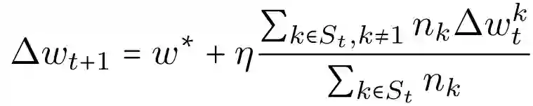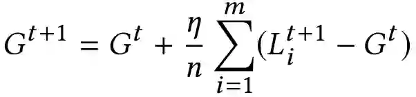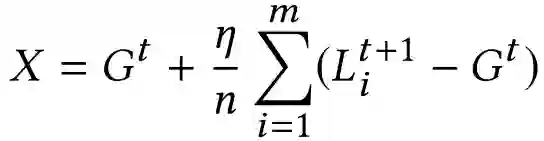 之后,客户端将差值 L^(t+1)-G^t 发送给中央服务器,中央服务器根据收到的信息更新计算全局联合模型: