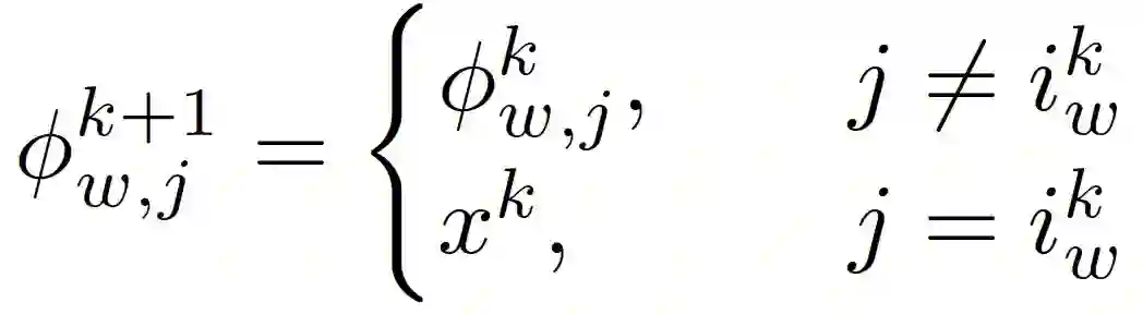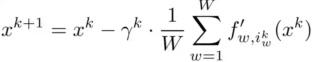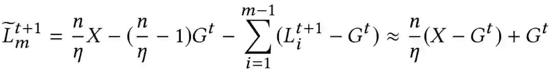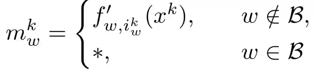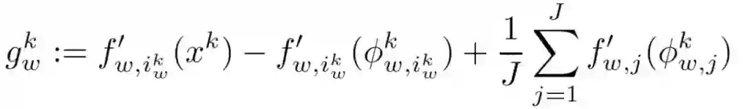 其中,ɸ^(k+1)_(w,j)是指在最近的 k 轮次结束时计算得到最新的 f’_(w,j)值的迭代。具体的,i^k_w 是本地数据样本的索引,即在轮次 k 由工作节点 w 基于数据样本 i^k_w 进行训练。f’_(w,j)(ɸ^k_(w,j))是指在工作节点 w、轮次 k 中,之前存储的第 j 个数据样本的随机梯度,以及可以计算得到: