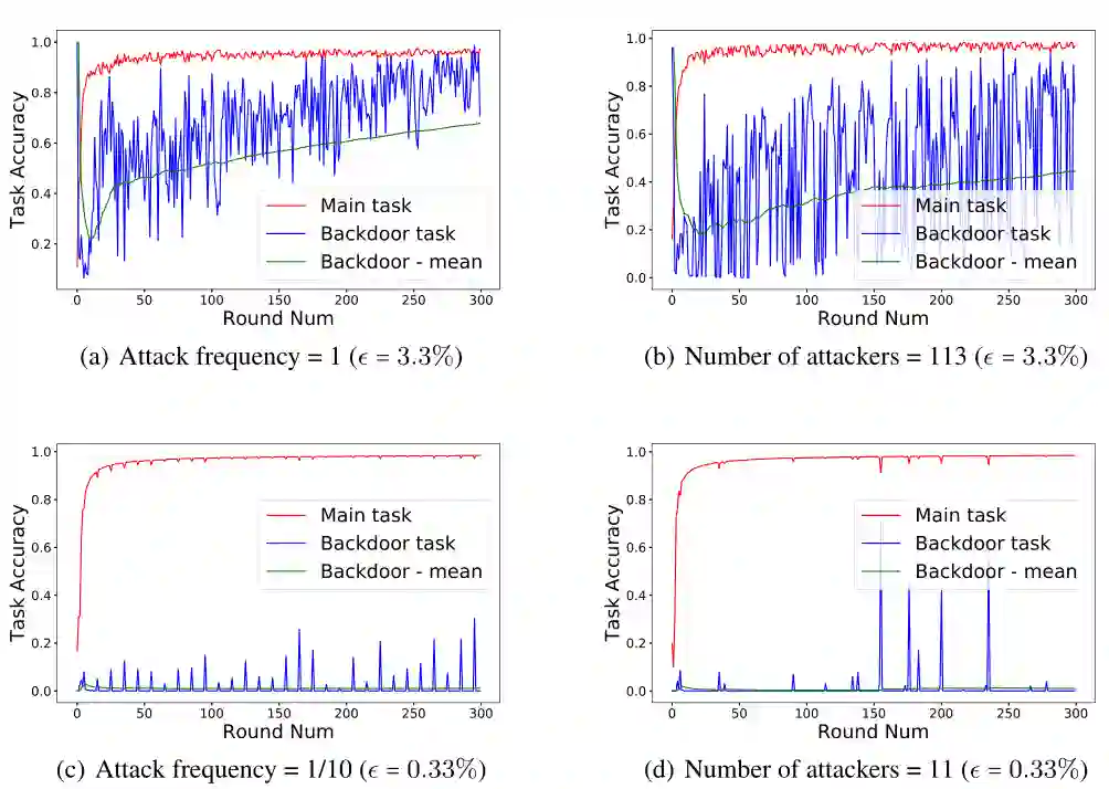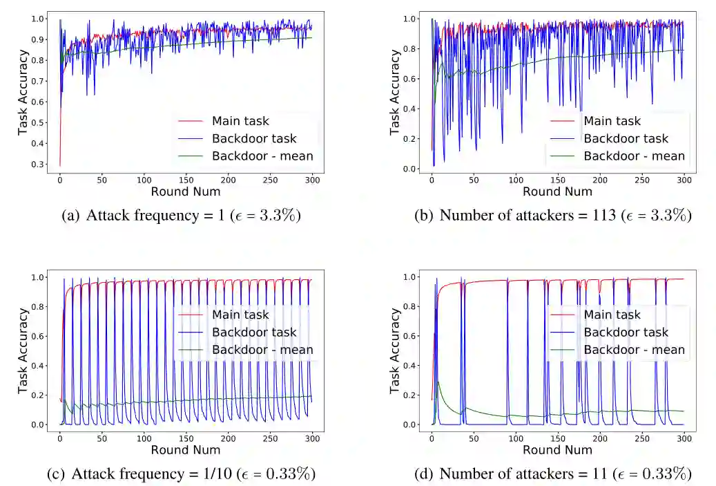首先,针对两种攻击模型进行实验,结果见图 1(无约束的加速后门)和图 2(范数约束后门攻击)。这些图表明,尽管固定频率攻击比随机采样攻击更有效,但两种攻击模型都有相似的行为。此外,在固定频率攻击中,更容易查看攻击是否发生在特定回合中。
