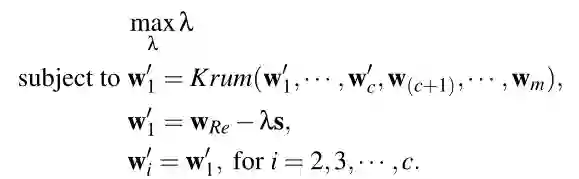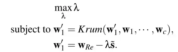 在掌握全面知识的情况下,解决优化问题的关键挑战是优化问题的约束是高度非线性的,并且局部模型的搜索空间非常大。作者提出下面两个假设。首先,将 w’_1 限制如下:w’_1=w_Re-λs,其中 w_Re 是当前迭代中从主设备接收的全局模型(即上一次迭代中获得的全局模型),并且λ> 0。其次,为使 w_1 更有可能被 Krum 选择,将其他 c-1 折衷的局部模型设计为接近 w’_1。基于这两个假设,将优化问题转换如下:
