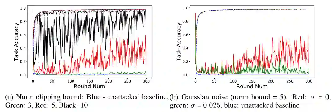 在图 3(a)中,考虑了每个用户的范数阈值更新。假设每一轮出现一名攻击者,对应于ε = 3.3%的被破坏的客户端,范数边界为 3、5 和 10(大多数回合中 90%的正常客户端的更新低于 2),这意味着在提升之前更新的范数阈值为 0.1、0.17、0.33。从图中可以看出,选择 3 作为范数阈值能够成功缓解攻击,而对主要任务的性能几乎没有影响。因此,作者认为,范数阈值可能是当前后门攻击的有效防御措施。在图 4(b)的实验中,作者在范数阈值中加上了高斯噪声。从图中可以看出,添加高斯噪声还可以帮助减轻攻击,而不会超出常规限幅,且不会严重损害整体性能。