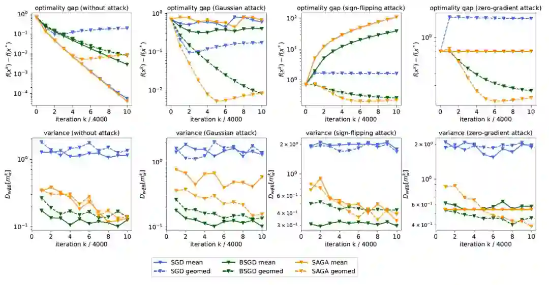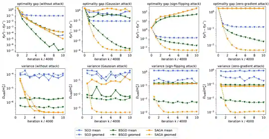 图 4:COVTYPE 数据集上使用均值和几何中位数聚合规则的分布式 SGD、mini-batch (B)SGD 和 SAGA 的性能