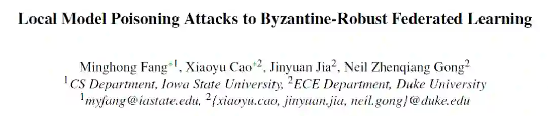 本文是 Duke 大学 Gong Zhenqiang 教授组的一篇文章,发表在 USENIX Security Symposium 2020,重点讨论如何在拜占庭鲁棒的联邦学习方法中制造有效的模型攻击。该研究的具体内容属于模型攻击(Model Attack)类问题。经典的联邦学习数据中毒攻击(Data Poisoning Attacks)主要是通过攻击者破坏受其控制的客户端中的局部 / 本地数据来实现的。这种攻击对于拜占庭鲁棒的联邦学习是无效的。本文是首次针对具有拜占庭鲁棒性的联邦学习进行的局部模型中毒攻击(Local Model Poisoning Attacks)研究,其目标是在训练阶段破坏学习过程的完整性,如图 1 所示。