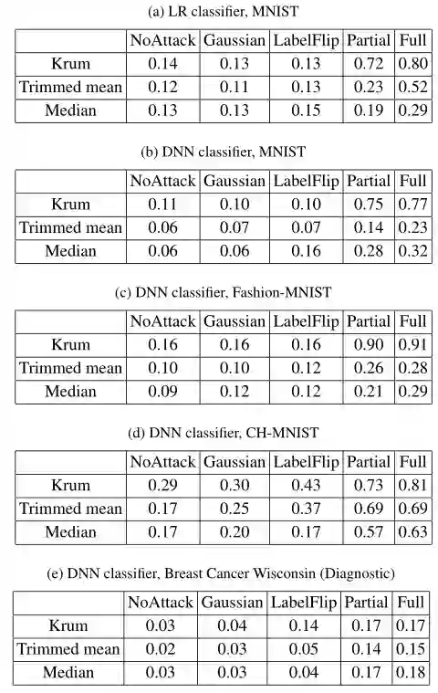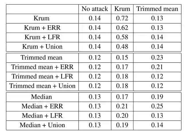 表 3 给出了针对不同聚合规则的攻击的防御结果,表中的数字表示错误率,实验环境设置为 MNIST 数据库和 LR 分类器。「 Krum」和 「 Trimmed Mean」 列表示攻击者在进行攻击时假定的聚合规则,而各行则表示实际的聚合规则和防御措施。对于每个局部模型,当包含局部模型时,使用聚合规则来计算全局模型 A;在排除局部模型时,使用全局规则 B 来计算全局模型 B。该实验在验证数据库上计算全局模型 A 和 B 的错误率,分别记为 EA 和 EB,将 EA-EB 定义为局部模型的错误率影响,基于错误率的拒绝(Error Rate based Rejection,ERR)。较大的 ERR 表示如果在更新全局模型时将局部模型包括在内,则局部模型会显着增加错误率。此外,实验中还考虑另外一个指标:基于损失函数的拒绝(Loss Function based Rejection,LFR)。像基于错误率的拒绝一样,对于每个局部模型,计算全局模型 A 和 B。在验证数据库上计算模型 A 和模型 B 的交叉熵损失函数值,分别记为 LA 和 LB,将 LA-LB 定义为局部模型的损失影响。像基于错误率的拒绝一样,删除损失影响最大的 c 个局部模型,并汇总其余局部模型以更新全局模型。表 3 中的 Union 表示 ERR+LFR。