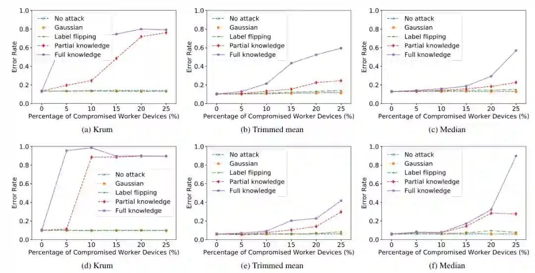 上面讨论的拜占庭鲁棒聚集规则可以在目标函数的某些假设下,渐近地限制学习的全局模型的错误率,并且其中一些(即修整后的均值和中位数)甚至可以实现阶数最优的错误率。这些理论上的保证似乎强调了操纵错误率的困难。但是,渐近保证不能准确地表征学习模型的实际性能。尽管这些渐近错误率对于局部模型中毒攻击仍然有效,因为它们对于拜占庭式失败也有效,在实践中,本文提出的攻击仍可以显着提高学习模型的测试错误率。攻击者能够掌握被破坏的工作节点设备上的代码、本地局部训练数据集和局部模型、聚合规则等。