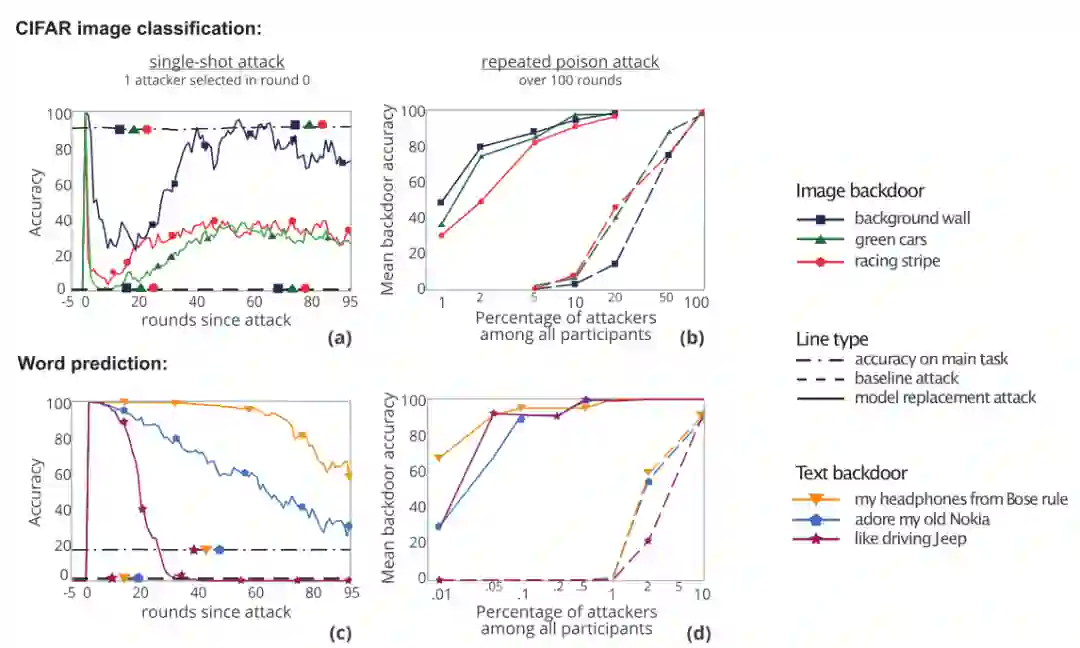 图 4:后门准确度,a + b:带有语义后门的 CIFAR 分类;c + d:带有语义后门的单词预测。a + c:单发攻击;b + d:反复攻击