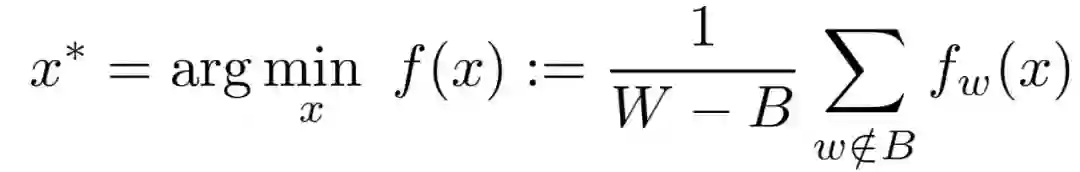 考虑一个网络有一个主节点(中央服务器)和 W 个工作节点(客户端设备),其中 B 个工作节点是拜占庭攻击者,他们的身份不为主节点所知。W 是所有工作节点的集合,B 是拜占庭攻击者的集合。数据样本均匀地分布在诚实的工作节点 W 上。f_w,j(x) 表示第 j 个数据样本在诚实工作节点 w 处的损失相对于模型参数 x 的损失。有限求和优化问题记为: