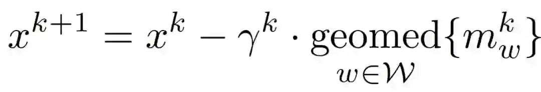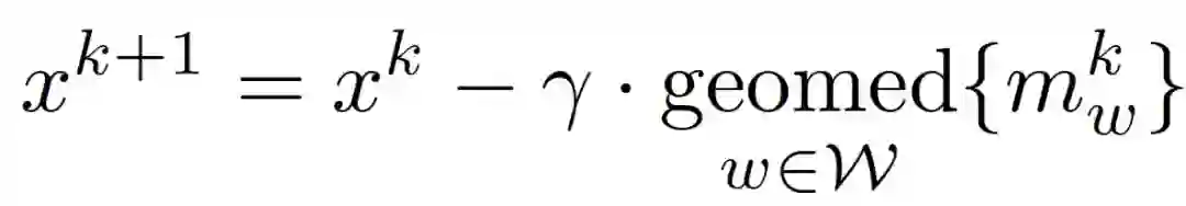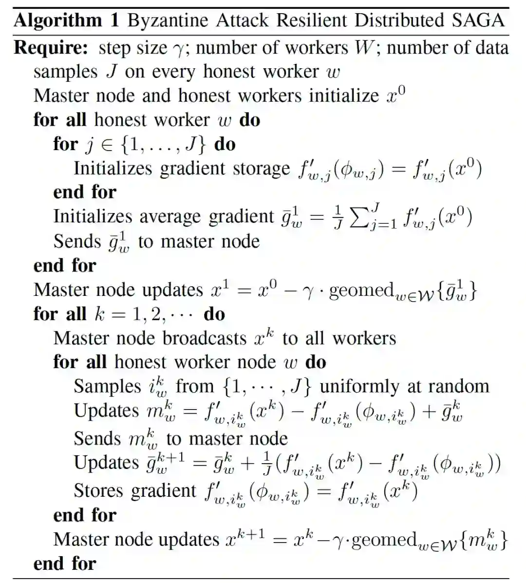 本文使用的鲁棒性聚集规则是几何中位数。这就引出了所提出的拜占庭攻击弹性分布式形式的 SAGA: