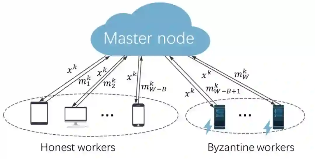 其中,γ^k 为非负步长。分布式 SGD 可以扩展到它的 mini-batch 版本,即每个工作节点均匀地随机选择一个 mini-batch 的数据样本,并将平均的随机梯度传回主节点。诚实的工作节点向主节点发送真正的随机梯度,而拜占庭的工作节点可以向主节点发送任意的恶意消息,以扰乱(偏置)优化过程。让(m_w)^k 表示工作节点 w 在轮次 k 向主节点发送的消息,给定为: