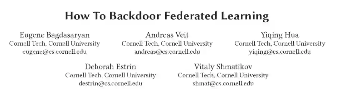 本文是 Cornell Tech 研究团队贡献的一篇文章,首次公开于 2018 年,最新收录于 AISTATS'20。这篇文章也是帮助理解联邦学习模型在遭受恶意用户攻击前后所出现的变化情况的一篇重要文章。本文研究重点是:如何对联邦学习框架进行后门攻击?即,重点描述如何能够有效攻击的方法,而不是解决攻击的方法。本文的研究属于定向攻击(Targeted Attacks)和模型攻击(Model Attack)类别。