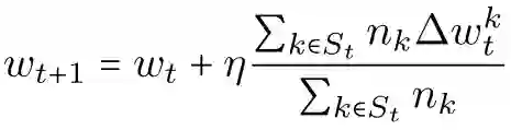 令 K 为联邦学习网络中的客户端总数。在每个更新回合回合 t,中央服务器随机选择 C⋅K 个客户端,C <1。令 S_t 为该客户端集合,n_k 为客户端 k 中的样本数,用 w_t 表示第 t 轮时的模型参数。每个被中央服务器选定的客户端都会计算模型更新,用Δ(w_t)^k 表示,中央服务器汇总各个客户端的Δ(w_t)^k: