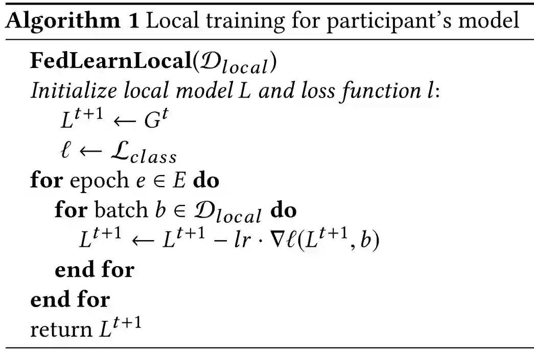 联邦学习通过将局部模型迭代聚合成一个联合全局模型,将深度神经网络的训练分布在 n 个参与者之间。在每一轮 t 迭代过程中,中央服务器随机选择 m 个参与者的子集 Sm,并向他们发送当前的联合模型 G^t。选中的参加者基于存储于本地客户端的私人数据训练得到新的本地模型 L^(t+1)。局部更新算法如下: