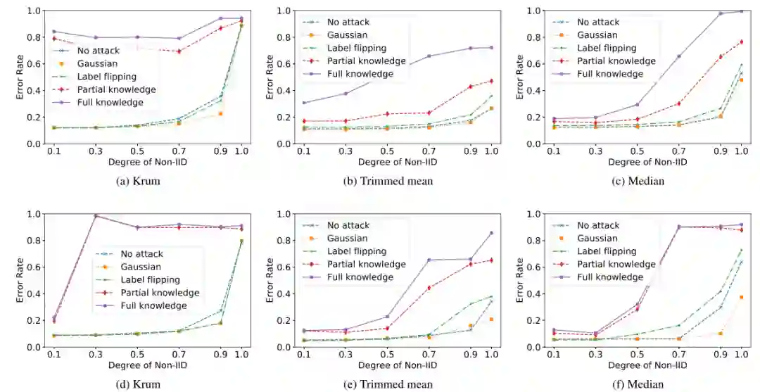 图 3 给出了针对 MNIST 上不同程度的非 IID 数据进行的攻击的错误率变化情况。包括无攻击在内的所有攻击的错误率都随着非 IID 程度的提升而增加,只有针对 Krum 的攻击的错误率会随着非 IID 的程度而波动。可能的原因是,由于不同工作节点设备上的局部训练数据集的非 IID 情况越来越严重,局部模型呈现更加多样化的分布状态,从而为攻击留下了更多空间。