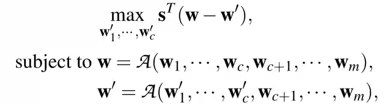 优化问题:攻击者的目标(本文称其为有向偏离目标)是使全局模型参数最大程度地偏离全局模型参数在没有攻击的情况下沿其变化的方向的反方向。假设在迭代中,w_i 是使用第 i 个工作节点设备计划在没有攻击时发送给主设备的局部模型。假定前 c 个工作节点设备受到了破坏。有向偏差目标是通过在每次迭代中解决以下优化问题,为受损的工作节点设备制作局部模型: