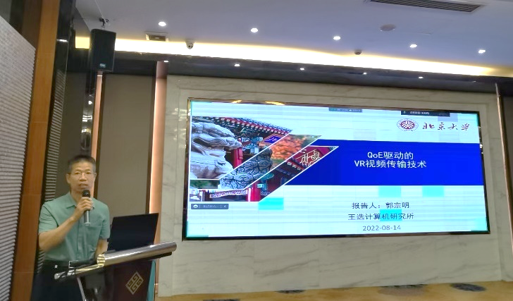 北京大学王选计算机研究所郭宗明研究员报告题目是“QoE驱动的VR视频传输关键技术”。报告介绍了视频技术在虚拟现实中的高质量传输研究难点以及基于QoE 驱动的视点自适应传输框架及挑战,详细介绍了QoE 传输模型、视点预测、全景视频映射和分块传输等关键技术,讨论了在带宽受限的网络上实现高质量的虚拟现实视频传输的技术方案。