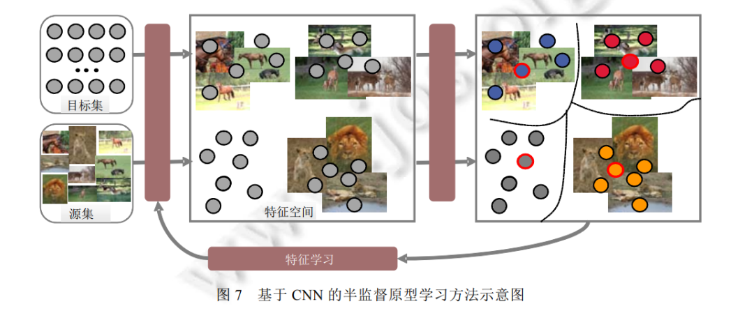 半监督下的原型学习需要通过带标签样本向不带标签样本的信息传递来推理出所有样本的权重及相 关性, 进而令权重较高的样本担任目标集的原型. 文献[57]提出了一种集成原型选择与特征学习的算 法, 这也是在半监督场景下学习原型的最新代表作;