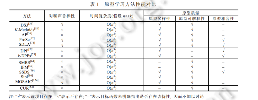 本文通过对现有文献的梳理和总结, 分别从原型学习的监督方式与模型设计两个层面, 介绍了已有的原 型学习方法. 目前, 原型学习方法依据监督方式可以分为无监督、半监督和全监督原型学习. 其中, 无监督场景最为常 见, 而半监督研究成果最为稀少. 然而, 由于语义信息的约束, 全监督下学习的原型具有更强的判别性, 而无 监督学习出的原型由于充分挖掘出目标集的分布与结构信息, 因此具有更强的代表性. 另外, 依据模型设计 的目标, 现有的原型学习方法主要有基于相似度/非相似度、行列式点过程、数据重构和低秩逼近的原型学习 这 4 种. 其中, 基于数据重构的原型学习对服从子空间分布的目标集更有效; 而基于相似度/非相似度的原型 学习虽然不限制数据特质, 但是需要事先提供一个极具判别力的度量空间; 基于行列式点过程的原型学习方 法能够利用行列式约束原型的多样性, 但是优化目标单一, 忽略了原型的可解释性等其他质量指标; 最后, 基于低秩逼近的原型学习原理最为直观, 同时也容易实现, 但是关于矩阵运算的复杂度在一定程度上限制了 该类方法在大规模数据集上的实施. 表 1 选取了无监督下常用的四大类原型学习方法作为对比参考, 因为其 他监督方式下的代表性方法较少, 所以在此不多加讨论. 由表1可以看出, 目前绝大部分原型学习方法都没有 灵活应对噪声的能力. 此外, 在原型学习时引入的约束越多, 原型的质量也越高, 分类效果越好. 但同时, 该 算法的复杂度随之有所提高.