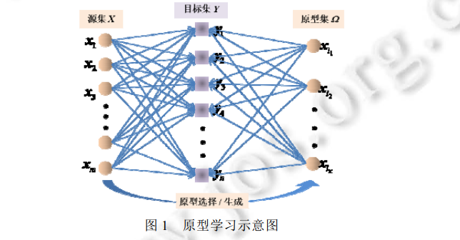 原型学习, 通常也被称为数据/示例选择(data/instance selection)[17,18]、子集选择(subset selection)[19]、样例 选择(exemplar/representative selection)[20,21]、核心集构造(core-set construction)[22,23].原型学习问题可以定义 为[7,24]: 假设有一个源集(source set) X={x1,x2,...,xm}和一个目标集(target set) Y={y1,y2,...,yn}, 分别包含 m 和 n 个 元素, 原型学习旨在从源集 X中寻找一个原型集/OmegaX, 使得/Omega能够最大程度地保持目标集 Y 所蕴含的信息; 同 时, /Omega中所有元素具有最少的重叠信息.