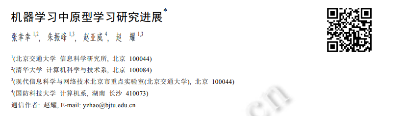 鉴于原型学习问题在机器学习中的重要性, 国内一些研究机构近些年也对此开展了相关研究, 诸如南京 理工大学的杨静宇教授课题组[10]、西安电子科技大学的焦李成教授课题组[11]、清华大学的张长水教授课题 组[12]、南京大学的周志华教授课题组[13]、北京大学的张志华教授课题组[14]、中国科学院自动化研究所的刘成 林研究员课题组[15]等. 这些课题组的工作主要围绕监督条件下的核学习、主动学习以及示例学习中的原型选 择、矩阵列选择问题、图像分类中的原型学习等进行研究. 此外, 国内的一些研究学者还基于粗糙集理论从 数据的不确定性角度开展数据约简研究[16], 这类方法虽然能够有效去除数据冗余进而发现数据结构, 但是对 获得的原型的代表性缺乏直观物理解释, 并且原型的质量还不足以满足众多应用的需求. 更为重要的是: 尽 管目前国内外学者已经发表了大量关于原型学习的研究成果, 但是关于原型学习的综述性文献却很稀少, 对 于原型的定义与解释也不够清晰. 因此, 本文梳理了原型学习领域的相关文献, 对不同文献所采用的方案、面 向的应用以及存在的问题进行了归纳总结. 通过对前人工作的学习与理解, 我们能够发现原型学习领域研究 近几十年来的理论与应用发展脉络. 同时, 通过分析近几年原型学习领域的最新研究成果, 我们可以把握当 前主流的研究兴趣与方向, 探究诸多应用背景对原型学习的具体需求, 从而对未来原型学习研究的理论与应用发展方向进行一定的预测, 进而更高效地地服务实际应用.