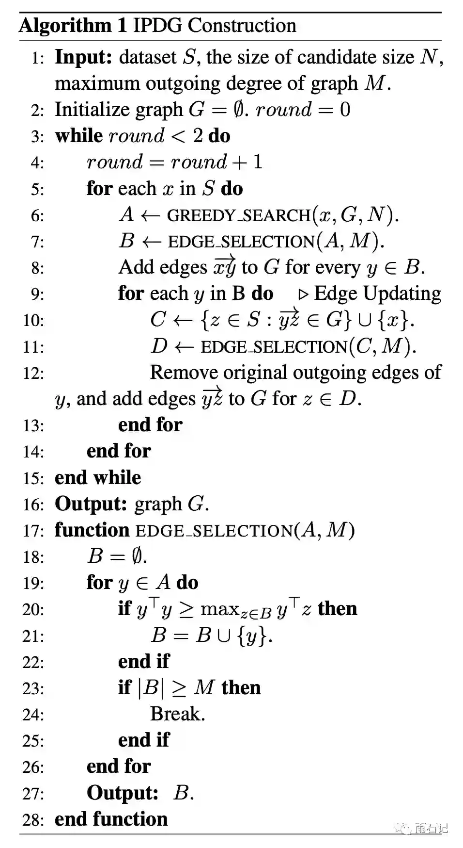 另外一个可以改进的地方是极点,因为极点是ip-Delaunay的骨干和精髓,所以极点上的边应该多一些,但是使用贪心策略构建德劳内图的时候,边多的点不是极点而是先加入的点。这就会导致变差了。所以提出了一种循环更新法,即在构建好Delaunay图之后,对于每个点,再重新更新一遍邻居节点。